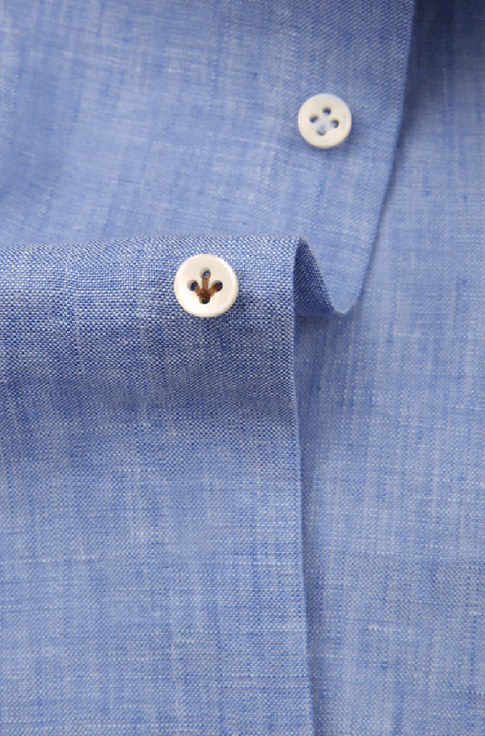 細(xì)節(jié):本款藍(lán)色手工襯衫為釘扣領(lǐng)設(shè)計(jì),兩枚釘扣將領(lǐng)尖固定的硬挺而有型,在休閑中多添了一絲嚴(yán)謹(jǐn),在嚴(yán)肅中又注入了一絲運(yùn)動(dòng)風(fēng),可正式可休閑,文藝又儒雅。再加上極度舒適的天藍(lán)色調(diào),男士們穿上一定清新優(yōu)雅,魅力非凡。