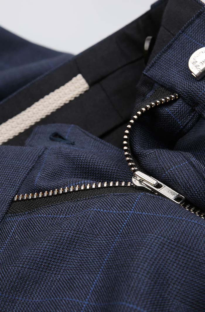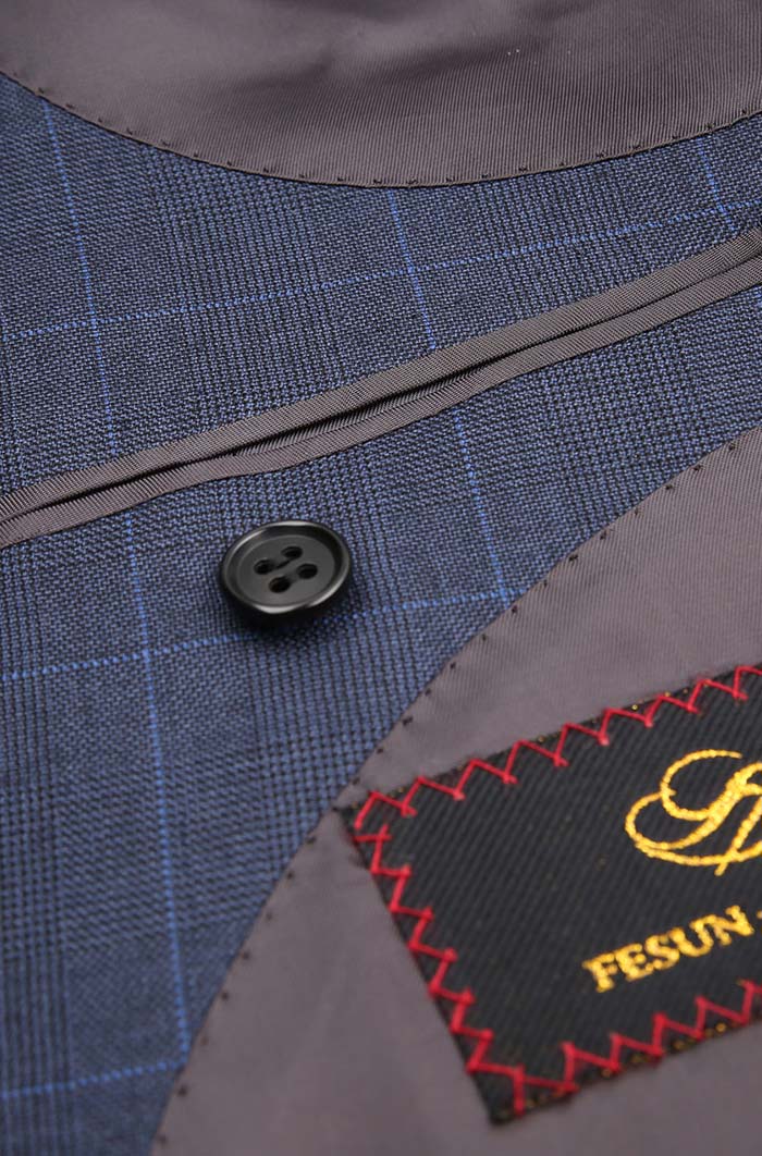細節:本款深藍色窗格紋套裝為單排扣平駁領,搭配佩斯利花紋領帶與同色系格紋馬甲,是商務男士們一個正式又不乏創意的選擇,整套裝束得體而精神,在商務交談中很容易達到被信賴與值得托付的效果。